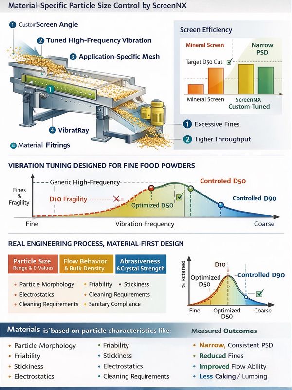Many high-frequency screens in the market are designed for minerals or aggregates and later repurposed for food powders. This approach leads to: